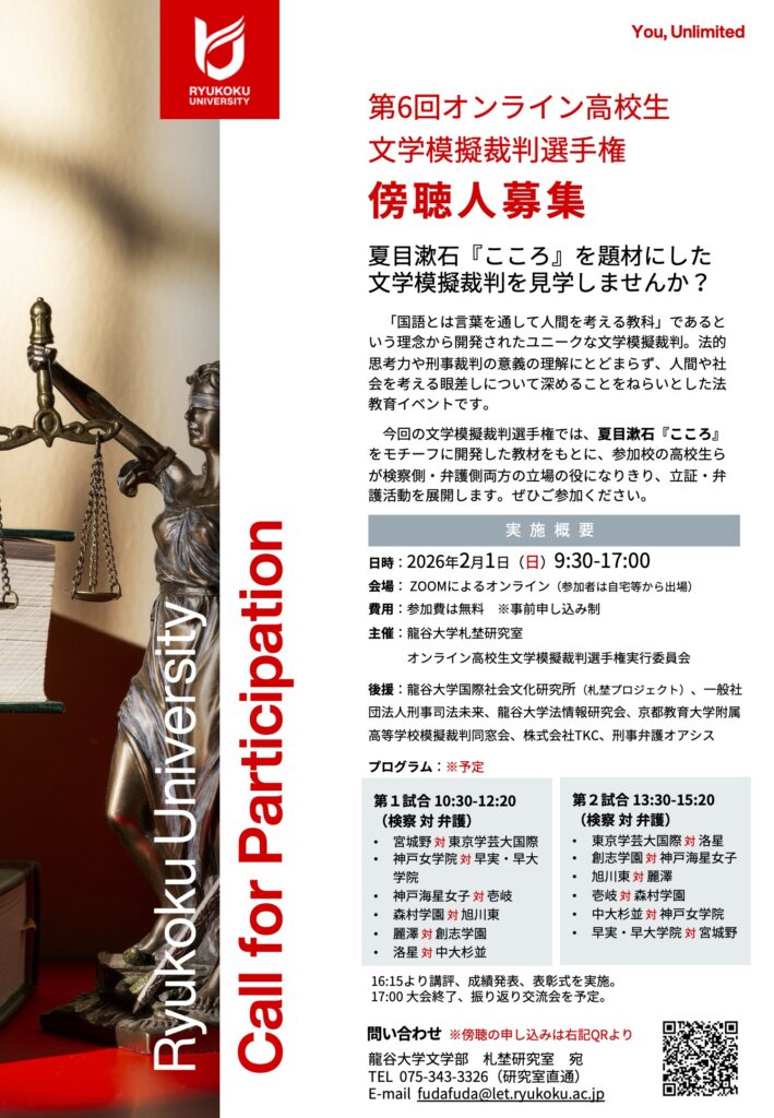 龍谷大学文学部・札埜研究室は、2026年2月1日(日)に、全国13校(12チーム)の高校生が対抗する文学模擬裁判イベント「第6回オンライン高校生文学模擬裁判選手権」を実施します。