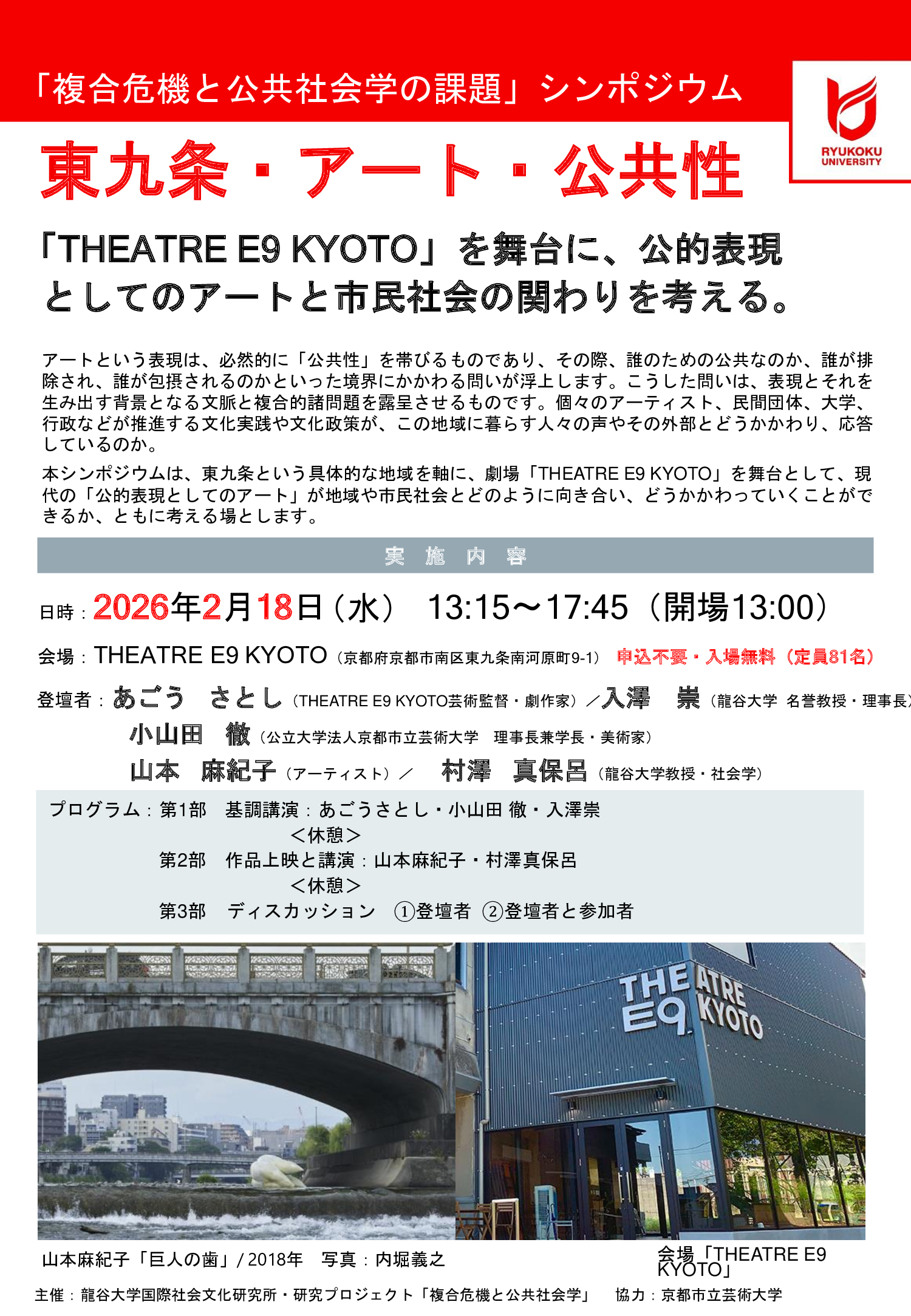2026年2月18日(水)13:15-17:45、当研究所:研究PJが主催する講演会「THEATRE E9 KYOTO」を舞台に、公的表現としてのアートと市民社会の関わりを考える。」が開催されます。